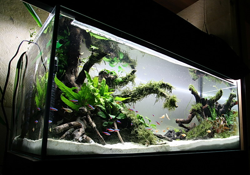Ich kann mich meinen Vorrednern nur anschließen: Ein sehr interessantes Becken, mir gefällt es gut, wenn Pflanzen oben rauswachsen. Die Anordnung von Wurzeln, Steinen und Pflanzen ist gut gelungen.