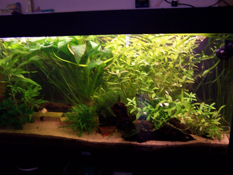 sie mögen es gerne gedämpft, ich hab nur 2 38 Watt-Röhren, eine bräunliche dabei ( Tropic solar). Zusätzlich jede Menge Froschbiß, das linke Dritel ist voll davon, der Echi liegt mit den Blattenden auch oben auf. So sind sie auch tagsüber unterwegs, allerdings verschwinden sie bei jeder schnellen Bewegung vor dem Becken.