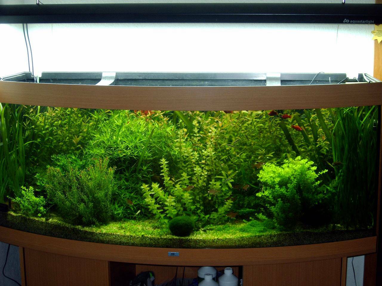 danke für lob und kritik! aber ihr werdet es nicht glauben, das ganze becken ist mehr oder weniger nach Schna....... eingerichtet worden mit pflanzen die ich vorher noch nie hatte, außer vallisneria und h. polysperma, ich teste welche pflanzen unter dieser beleuchtung und mit dem neuen co2 außenreacktor dm 50 inklusive externen 900 ltr. filter( für den dm 50)am besten wachsen, die mooskugel habe ich einfach so nach entsprechender vorbehandlung reingelegt :lol2: ich werde auch nicht mehr viel ändern weil das ganze becken samt bodengrund in den nächsten wochen leer gemacht wird! es kommt neuer bodengrund rein und basaltsplitt schwarz, dann werde ich die alten und neuen pflanzen entsprechend anordnen :lol2: ich habe auch mit der höhe der 4x80 watt lampe experementiert, genauso mit osmosewasser und vollentsalzung :wink2: die bodendecker es sind 2 sorten kommen auch raus, ich habe mich für eine andere sorte entschieden Pogostemon helferie.