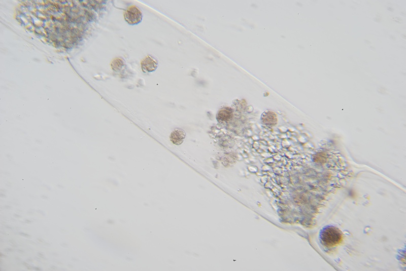 Die braunen Kugeln sind die Pilze und der "Schotter" rechts in der Zelle die Ausscheidungen der Pilze.