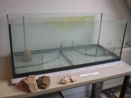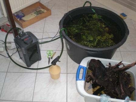 Die Fische kommen während dem Umbau in einen (neuen) Mörtelkübel und ist also kein Probelem; es kann ein paar Tage dauern da ich für die Abtrennung Sand/Kies Silikon und Glasstreifen nehme.