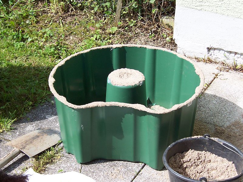 Er ist zur Hälte eingegraben, dann die Erde bis zum Rand schräg aufgeschüttet und mit den Steinen bestückt.