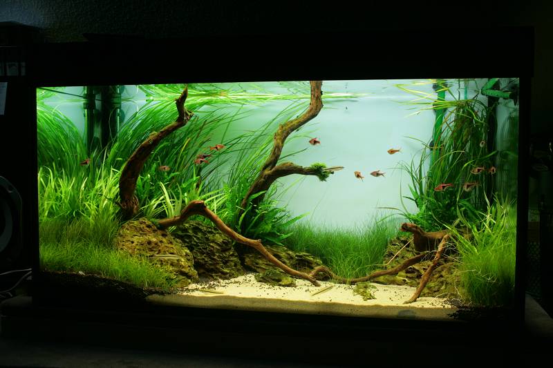 An Pflanzen im Hintergrund sind Cyperus helferi,Echinodorus angustifolius und Vallisneria nana im Mittelgrund Echinodorus latifolius.