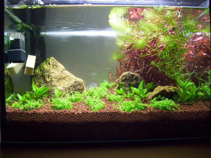 Hinter dem linken Stein kommt noch Nadelsimse vor, da hat jetzt jede gesetzte schon 4-5 neue Triebe gemacht! Die Staurogyne wächst mir etwas zuviel in die Höhe, teilweise schon 10cm (vl liegts am DeponitMix), die Nasaea muckt bisher nicht und die HC Polster schließen sich langsam!