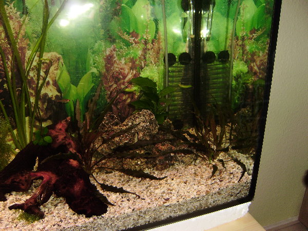Mein Problem war immer, das sich das AQ erst richtig gut entwickelt hat und dann Umgekippt ist. Hab davon leider keine Bilder mehr. Erst kam alles super in Schwun, die Pflanzen und die Fische (Nachwuchs usw). Aber als ich dann beim ca 3. oder 4. mal Gärtnern Planzen kürzen oder rausschmeisen mußte kippte es um. Bis dahin hatte ich hin und wieder mal ein paar Algen, die ich aber eigentlich immer wieder in den Griff bekommen habe.