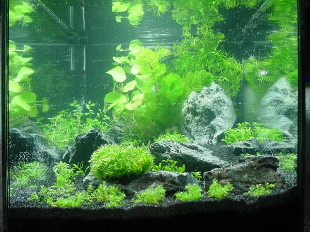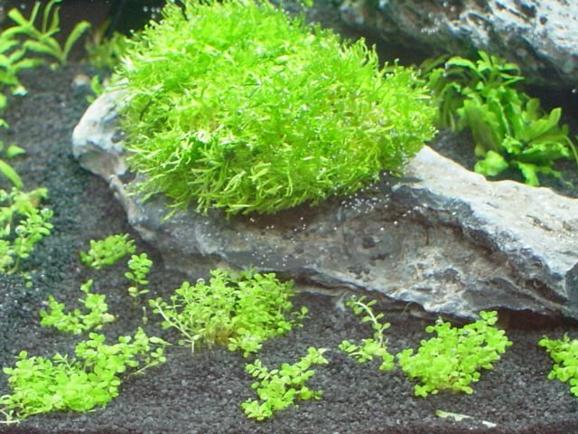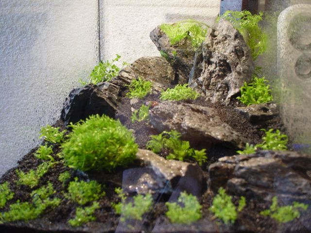Hemianthus ..... cuba für vorne natürlich bischen weiter oben Pogostemon helferi,als Hintergrund Pflanzen entweder Heteranthera zosterifolia oder Pogostemon stellata und ein Moos Tortula ruralis (Star moss) für ein paar Felsnischen.