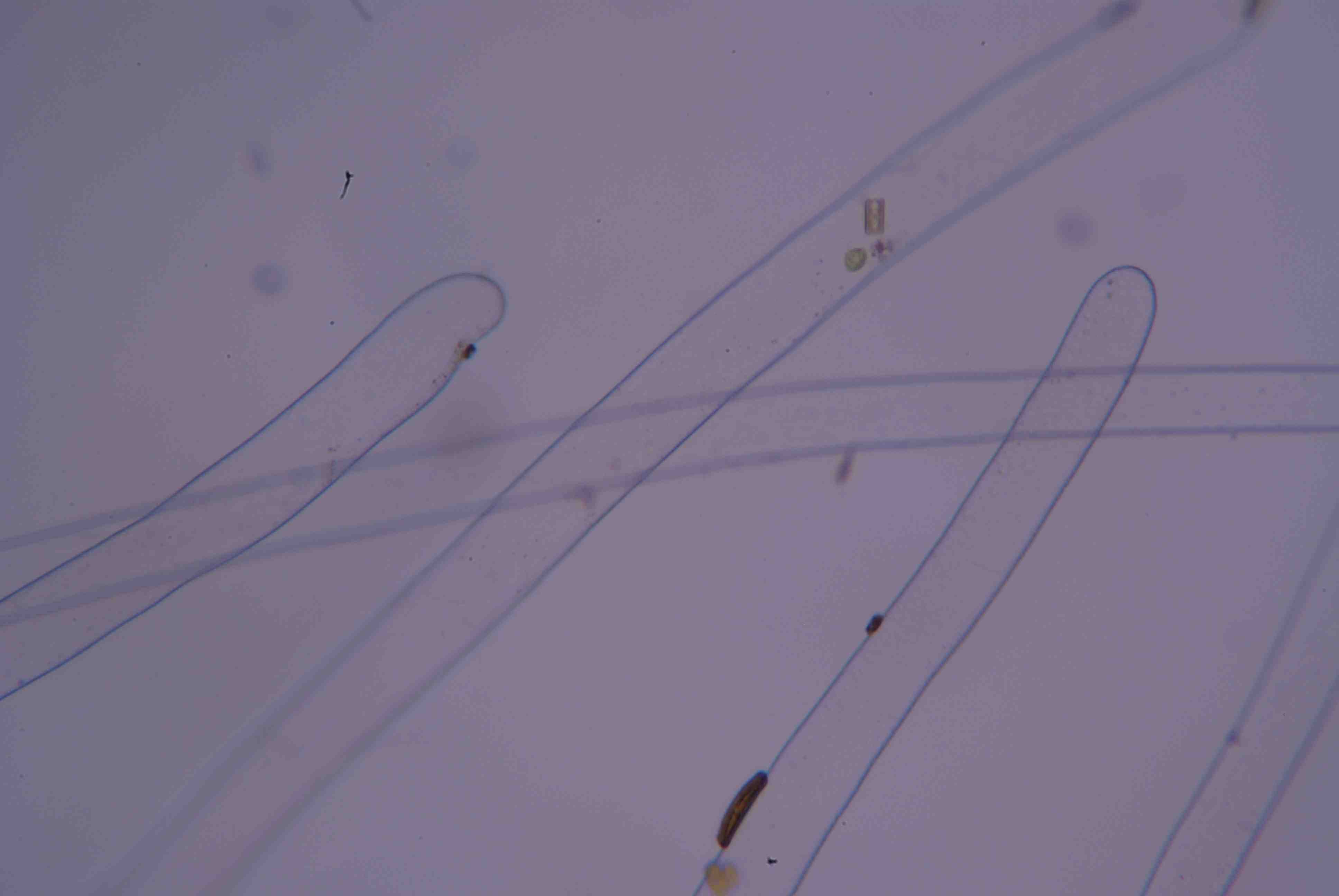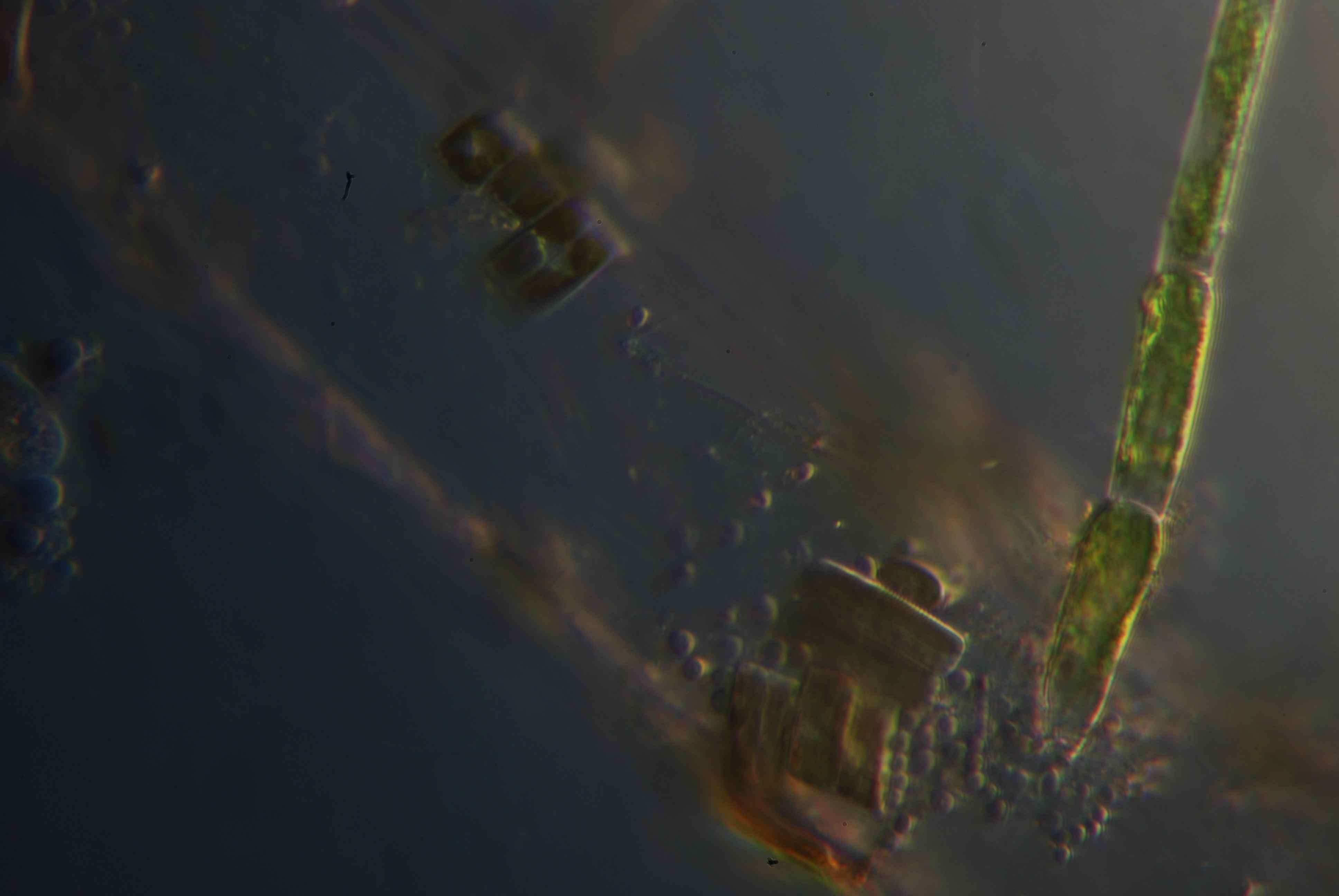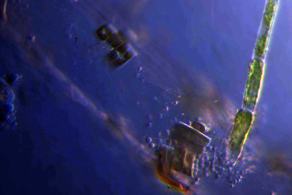 Bild 4: Hier sieht man von rechts unten nach links oben die farblose Wurzel und verschiedene Algen sowie Bakterien. Aufgenommen in einer Art Dunkelfeld bei 400-facher Vergrösserung.