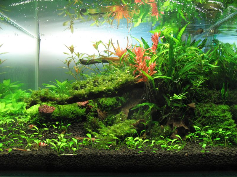 Bei mir wächst es sich langsam ein, das Flame Moos bekommt schon richtig kräftiges Grün und Das Perlkrat (samt Verwucherungen) treibt auch schon etwas und wächst dann bald hoffentlich zum "Rasen". Nachdem die kleinen Marmorkrebse aus dem Becken verbannt wurden ist jetzt auch weniger Abschnitt im Wasser am schwimmen...