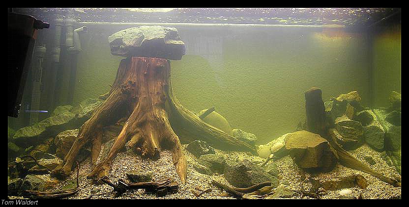 Mein aller erstes Becken war ein 200 Liter Becken mit Standardbeleuchtung von 60 Watt und einem Fluval Aussenfilter. Das ding war voll mit Pflanzen und komplett bunt in meinem alten Zimmer.Nach 2 Monaten wars aber damit das Becken konnte nicht mehr so mit Pflanzenwuchs überzeugen...so ziemlich alles eingegangen.War auch klar es wurde nicht gedüngt und schwaches Licht.Nach dem Umzug in mein Kellerzimmer hab ichs dann nochmal neu eingerichtet aber das war alles nimmer so recht.In den letzten Monaten war es einfach komplett schwarzes Wasser und es war bis oben hin voll mit Wurzeln denn diese müssen ja auch irgendwo wässern.Paar Fische sind noch drin rumgeschwommen aber das war mir alles egal.