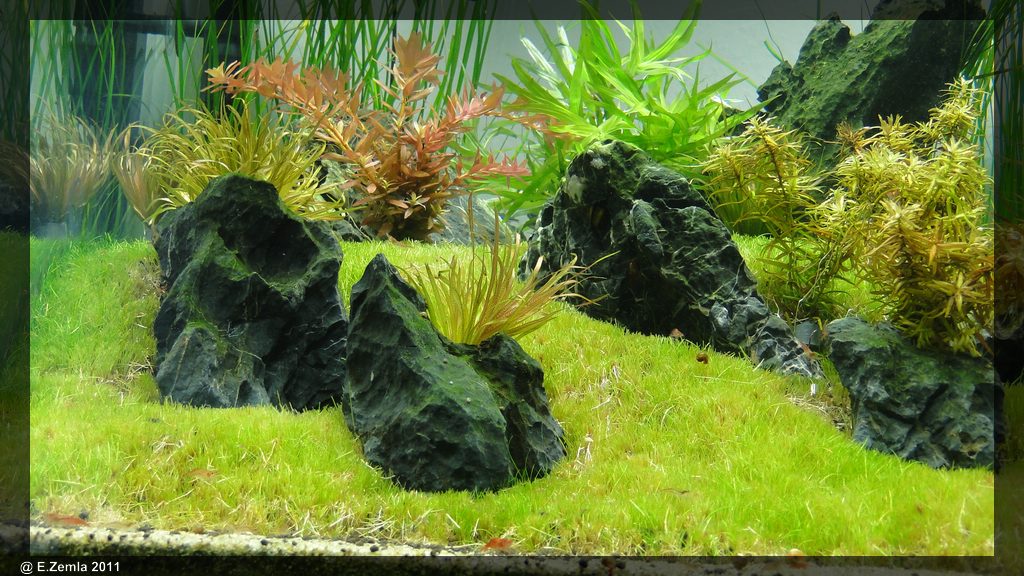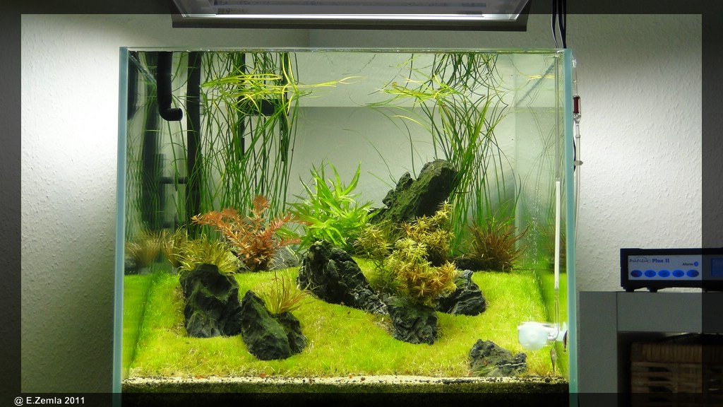 Bis auf die Simse und die nana sind alle Pflanzen nur mit Blei beschwert und locker im Becken verteilt.