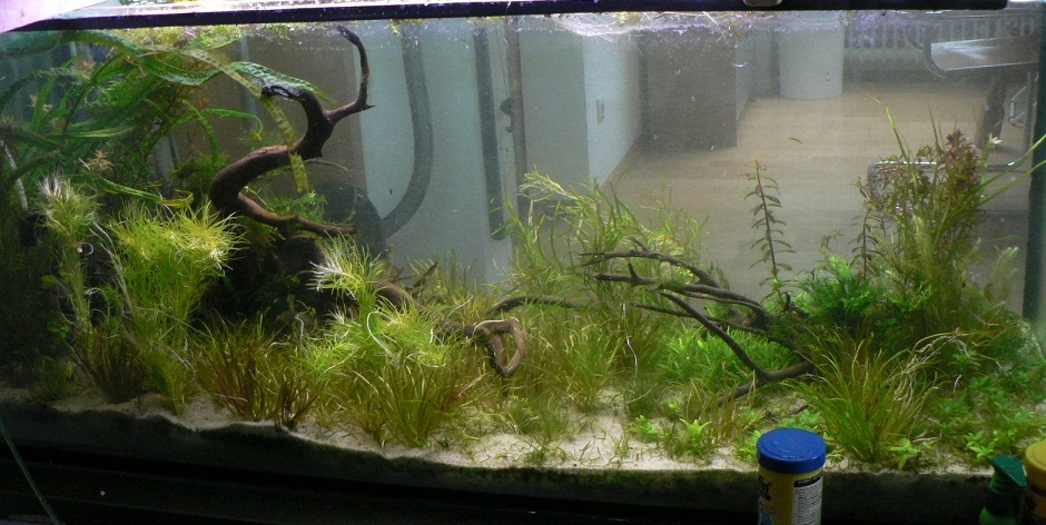 Wie gesagt, ich habe heute fast das komplette Wasser rausgeholt und neues rein. Ohne Dünger oder sonstiges. Ich habe auch ordentlich alte Pflanzenmasse rausgeholt. Die Ludwigia arcuata und die Micranthemum waren schon teilweise total abgegammelt. Das wenige was an schönem Neuwuchs da ist habe ich behlaten und neu gesteckt. Sieht man auf den Bilder allerdings nicht. Vor einer Woche habe ich auch etwas Ludwigia Repens gesteckt. Sie wächst seitdem mit frischem grün, aber selbst ihr Wachstum ist gegenüber dem was ich von früher kenne einfach viel zu langsam. So, jetzt geh ich mal wieder über Baugeschichte brüten.