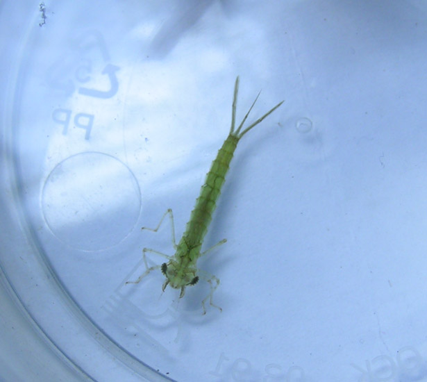 nachdem die Libellenlarve mittlerweile innerhalb der letzten Wochen doch eine beachtliche Größe erreicht hatte und am Rücken kleine Ansätze sich zeigten, die imo vermutlich wohl bald die Flügel werden sollten - dachte ich es ist nun doch an der Zeit sie von dem Nano in den Teich zu befördern. Hatte sie mit dem Wasser vom Nano in ne kleine Tupperdose getan und die Dose schrittweise auf ca. 10Grad Teichtemp runtergekühlt, was der Libellenlarve gar nicht gut bekam und ich dachte schon sie wäre tot. :shock2: