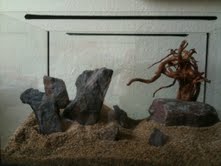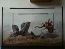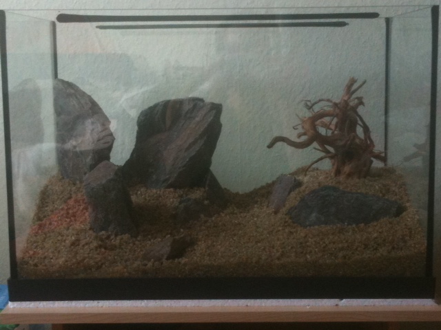 Dazu habe ich noch eine schöne Wurzel, die ich umgedreht als "Baum" einbauen wollte. Bodengrund ist 1-2 mm Kies, ohne Substrat o.ä.