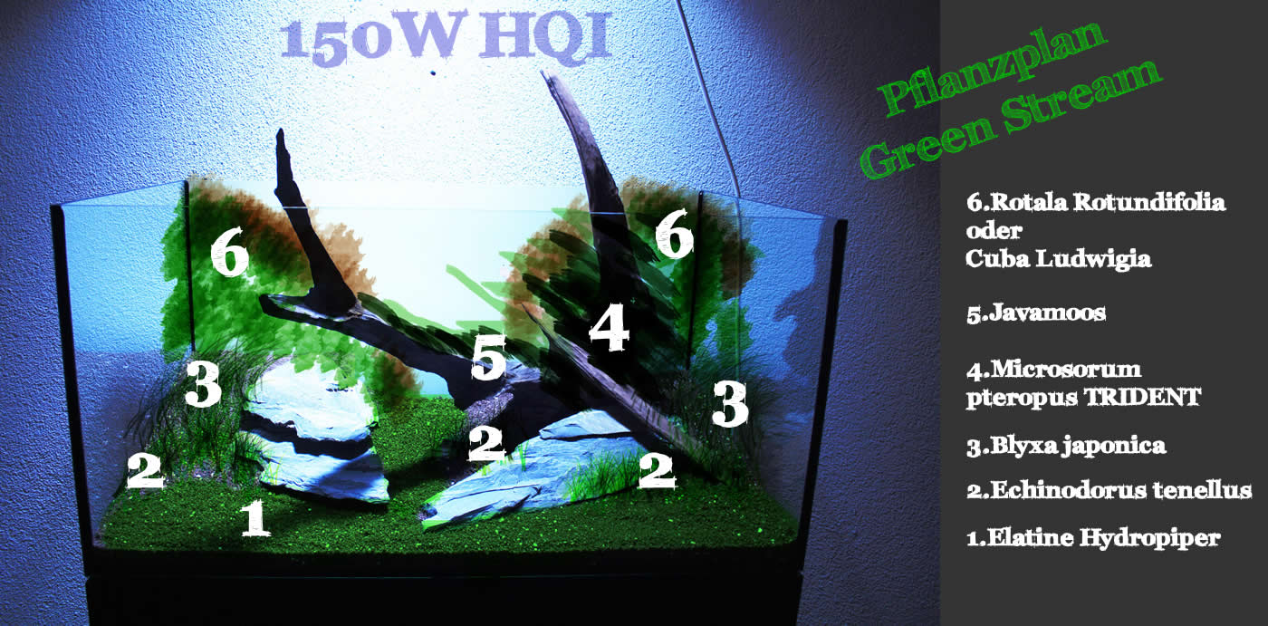 Die Hydropiper soll die ganze Fläche von vorne der Scheibe entlang bis nach hinten an die Rückscheibe bedecken, deshalb auch Green Stream... Von der sehr flach wachsenden Hydropiper zur Blyxa möchte ich Echinodorus tenellus verwenden, ich erhoffe mir mit diesen Pflanzen einen hübschen Übergang.