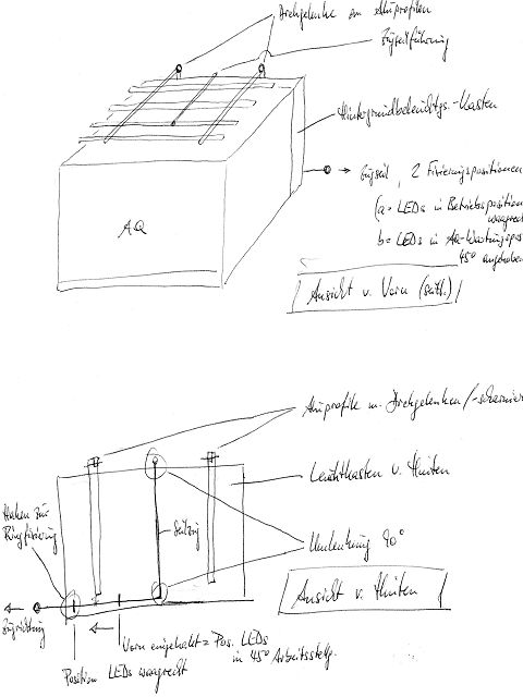 Mein Gedanke war, hinter dem Hintergrundleuchtkasten zwei Schienen/Stäbe anzubringen, die parallel senkrecht verlaufen und erlauben, die LED-Schienen etwa 5cm über der Beckenoberkante waagrecht in Betriebsposition zu halten, indem die parallel verlaufenden LED-Schienen ebenfalls an zwei parallel im rechten Winkel zu ihnen verlaufenden Schienen befestigt sind, deren Enden jeweils mit den oberen Enden der senkrechten Schienen hinter der Rückwand per Gelenk verbunden sind, das zur Betriebsposition einen Anschlag hat, damit dann alle LED-Schienen waagrecht über dem AQ schweben.