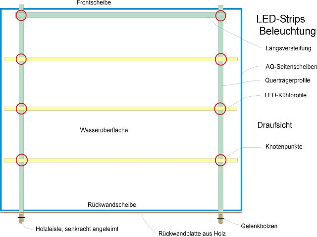 Über dem AQ sind in der Seitenansicht die Querversteifungen zu sehen, die von der Front- zur Rückwandscheibe und jeweils etwas darüber hinaus ragen. Hinten wird jede der beiden Querversteifungen per Gewindebolzen und aufgesetzter Stopmutter (natürlich mit beidseits unterlegten U-Scheiben) als Gelenkverbindung mit den Holzleisten verbunden, die senkrecht an die hinter der AQ-Rückwandscheibe stehenden Holzrückwand geleimt sind. Somit läßt sich die gesamte Beleuchtungseinheit an jenem Gelenk rotierend Vorn anheben und nach Oben klappen (zB mittel Seil und Haken, von der Wand hinterm AQ aus fixieren), um im AQ Arbeiten zu können (zB wegen Gärtnerarbeit). Die Filterzu- und –rückläufe etc. sind nicht eingezeichnet, um nicht zu verwirren. Aber dafür müßt Ihr rundum genug Raum lassen, vor allem auch für die hochgeklappte Position! Also einfach dran denken und vorab messen, damit es hinterher keine Probleme gibt.