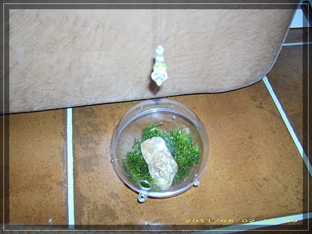 das Problem mit dem Abdichten ließ mir keine Ruhe ,also hab ich folgendes probiert: die Kugel um 90° gedreht, dann in Schüssel und Deckel je 3 kl. Löcher gebohrt , Angelschnur durch mit kl. Perlen gesichert und aufgehängt wie eine kl. Blumenampel.