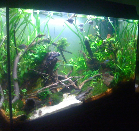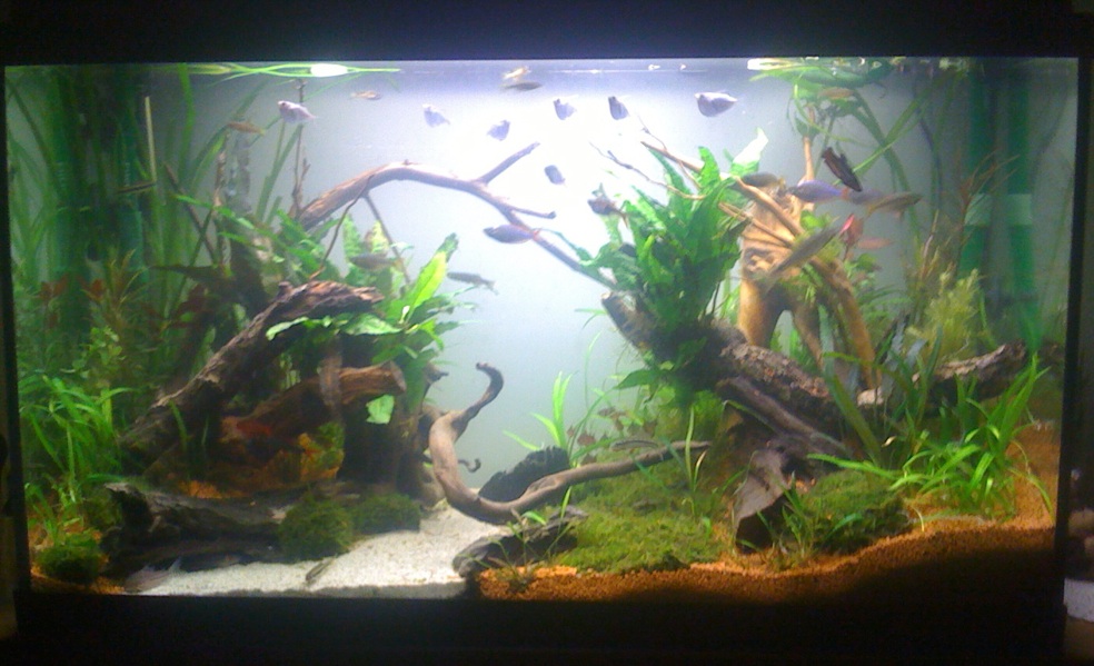 Den Bodengrund hab ich komplett und diesmal gegen durch und durch einfärbigen Kies getauscht. Meine Mama hat sich die Farbe ausgesucht. Die Milchglasfolie wurde auch angebracht. Die zusätzlichen Äste und Wurzeln sind eine Auswahl aus den selbstgesammelten Beständen, die ich vorher ein paar Wochen gewässert hatte. Den Pflanzenbestand hab ich zu 80% erhalten und das Moos (Danke noch mal an JK2) eingebracht. Ansonsten sind keine neuen Planzen dazugekommen. Ich hoffe sehr, dass der das Moos noch die eine oder andere Lücke zwischen den Steinen schließt, auf denen ich es mit Haarnetzen befestigt hab. Jetzt heißt es für die Pflanzen erstmal nur noch wachsen, wachsen, wachsen.