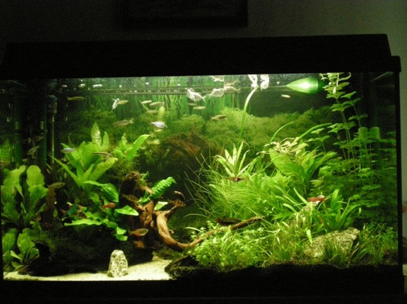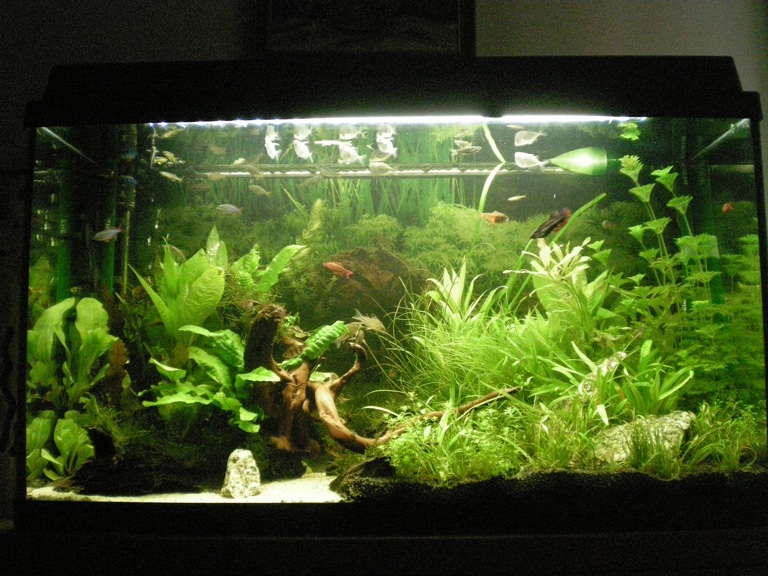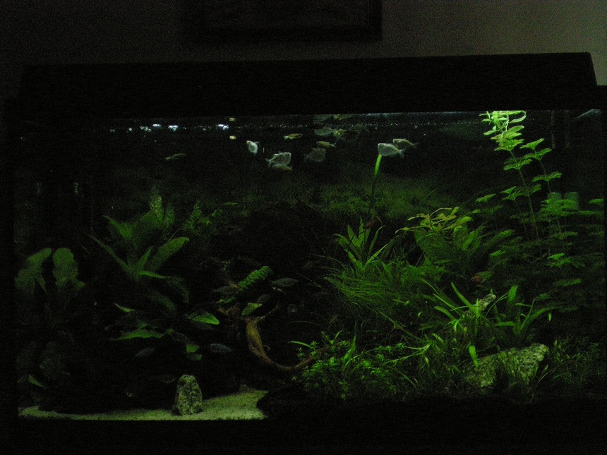 Einige Pflanzen meckern noch ziemlich, besonders im Vordergrund. Sie verlieren zwar keine Blätter, die dann herumschwimmen, dafür verfärben sie sich erst gelb dann braun. Andererseits bilden sie auch die ersten Ausläufer. (va. ET und Lilaeopis Novae-Zelandiae). Vallisneria nana verhält sich ähnlich. Glossotigma elatinoides wächst nicht, wird aber auch nicht weniger - mal abwarten, wie es sich weiterentwickelt. Elocharis aciularis kam schon mit braunroten Spitzen bei mir an. Bilde mir ein, dass es wäschst und das Grüne im Verhältnis zum Rotbraun mehr wird. Echinodorus grisebachii schiebt kräftig neue Triebe, obwohl bei der Mutterpflanze auch vereinzelt gelbe Blätter zu sehen sind. Micranthemum micranthemoides ist dabei Wurzeln zu schlagen und wächst ganz schön in die Höhe. Hygrophilia Thai Stricta fängt nun auch ganz langsam an zu wachsen, wie auch Samolus Valerandi, Hygrophila corymbosa und noch ein paar Pflanzen aus dem Altbestand meiner Mama, von denen sie nicht mehr weiß wie sie heißen, welche ich aber nur schwer bestimmen kann, weil es mindestens noch 4-5 andere Arten gibt, die ihnen sehr ähnlich sehen. Der Javafarn ist auch noch immer schön grün und auch das Moos fängt langsam mit dem Wachsen an. Der einzige Stengel Hornkraut ist nach anfänglichen Schwierigkeiten nun auch brav gewachsen und wartet wie Hygrophila polysperma "rosanervig" und ganz besonders Limnophila heterophylla auf einen Rückschnitt. Von Algen bislang keine Spur.
