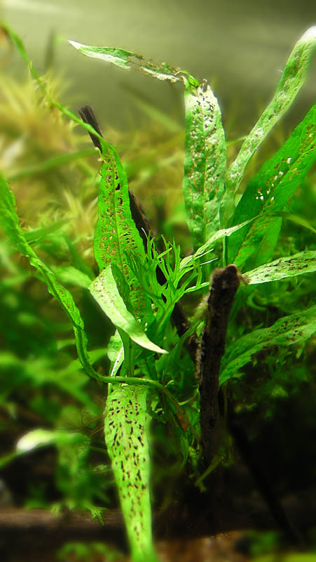hallo,... solche fraßspuren kenne ich nur von harnischwelsen, schau mal ob um die kleinen löcher auch " raspelspuren" zu finden sind. die pflanzen werden ja nicht gleichmäßig geschädigt, zuerst sieht man ein kleines loch was dann größer wird und das blatt rechgelrecht dünner " geschliffen "