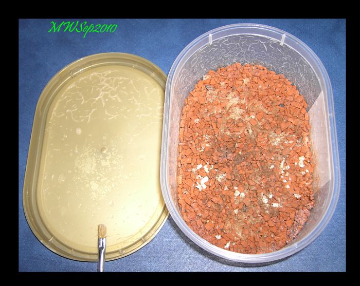 -Dann 500g Seramis (neu oder gebraucht evt. mit kochendem Wasser überbrühen) sauber auswaschen, bis kein roter Farbstoff mehr abgeht. In die Cremissimadose einfüllen. Wasser gut ablaufen lassen...