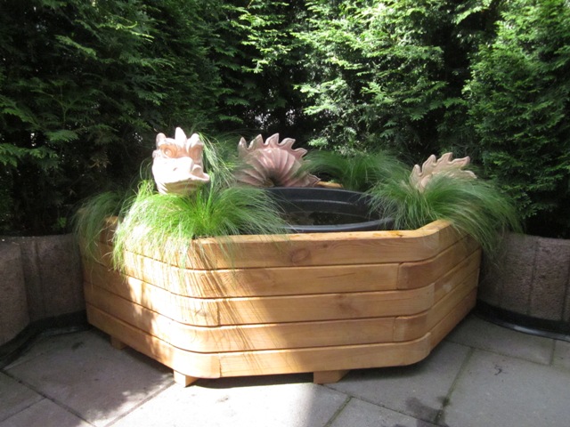 Waser ist aus Nachbars Gartenteich. Deshalb habe ich mich gewagt auch sofort Pflanzen einzusetzen. Drin sind nun zwei Seerosen mit Rntengrütze und etwas Hornkraut. Drumherum ist Ponygras gepflanzt.