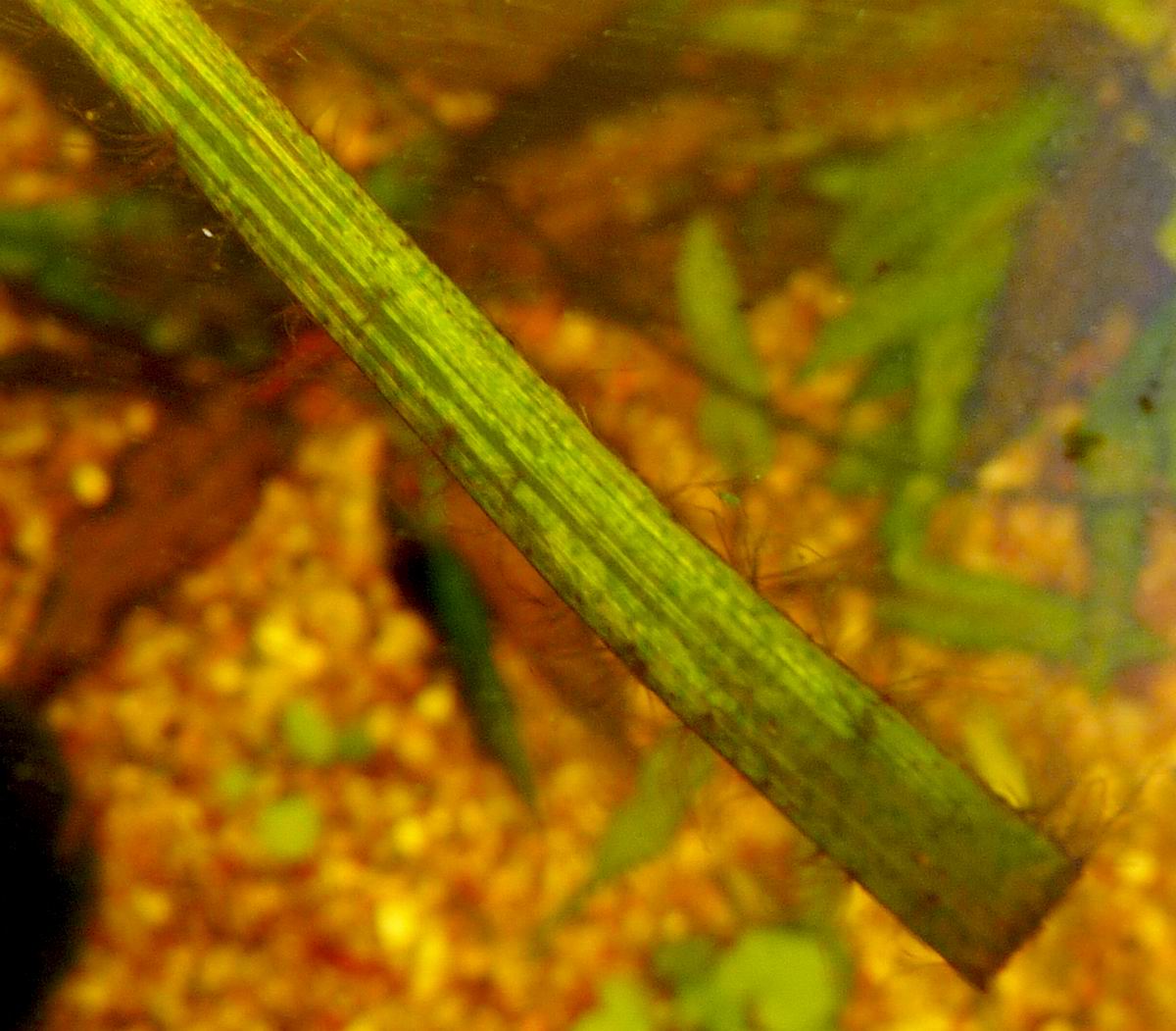 Im ersten Bild ist die Kahmhaut von unten fotografiert, die anderen sind Draufsicht. Absichtlich sind die wenigen Bartalgen am Blattende der Vallisneria mit drauf.