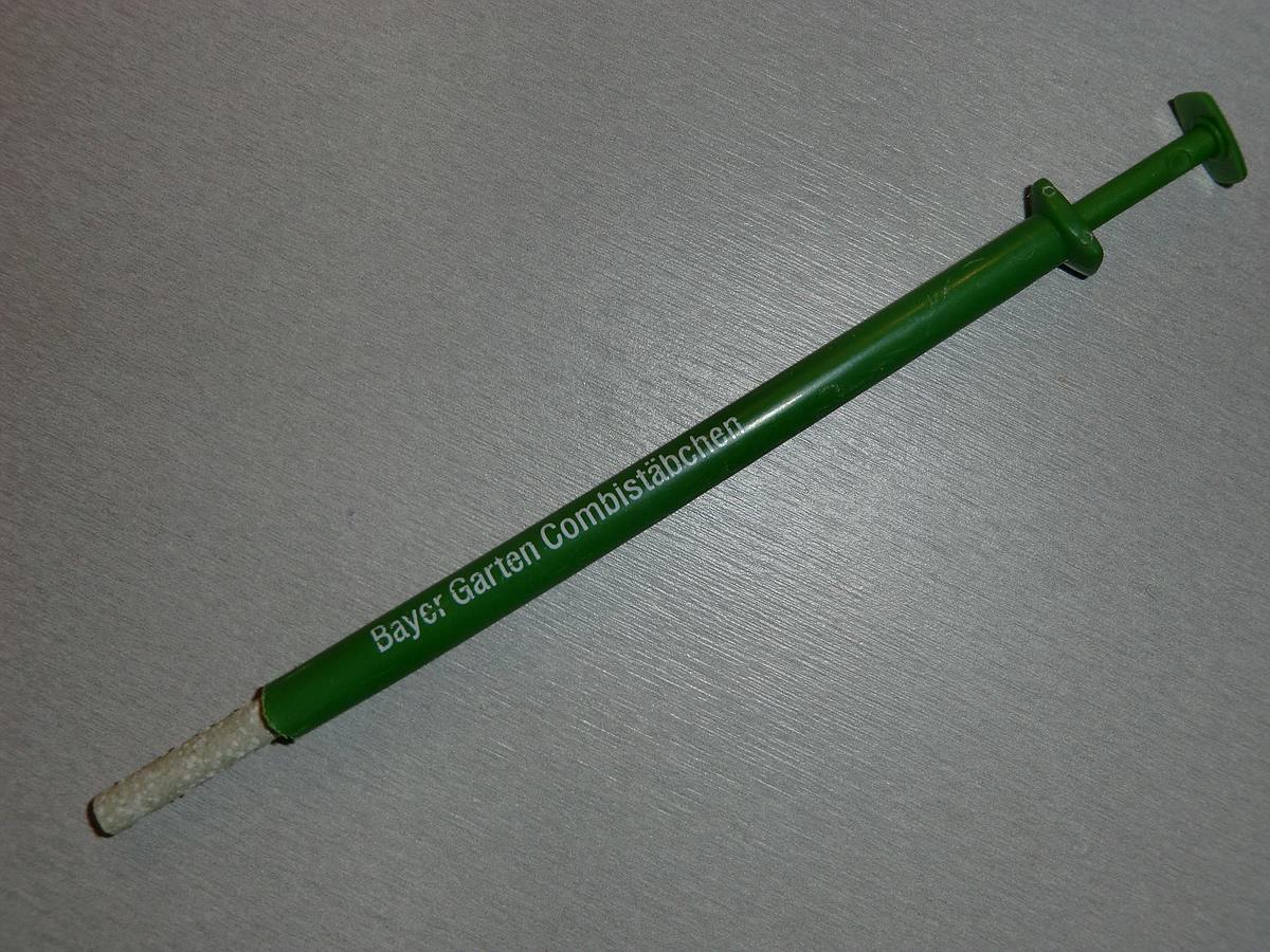 Anbei noch ein Bild des Aplikators und den Versuchsstäbchen von oben. Stand 29.12.2011. Klar zu erkennen ist, dass sie zwar eingeknickt bzw. gebrochen sind, aber sich noch immer nicht aufgelöst haben.