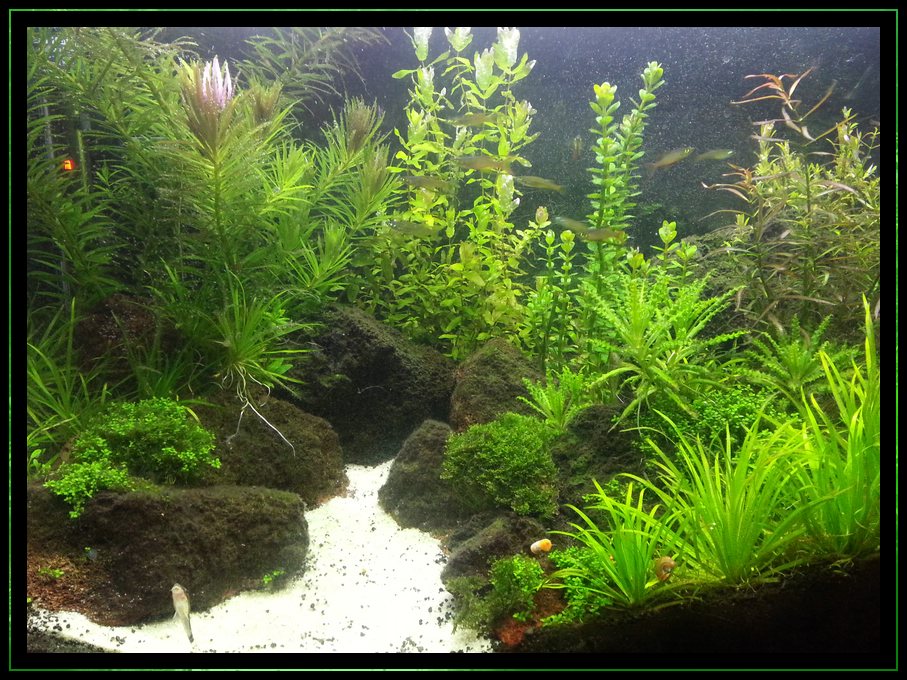 Rechts im Vordergrund hats sich die Utricularia verabschiedet, dafür hat sich meine Lieblingspflanze Blyxa kräftig vermehrt, ist eigentlich zu wuchtig für den Vordergrund, aber mir gefällts.