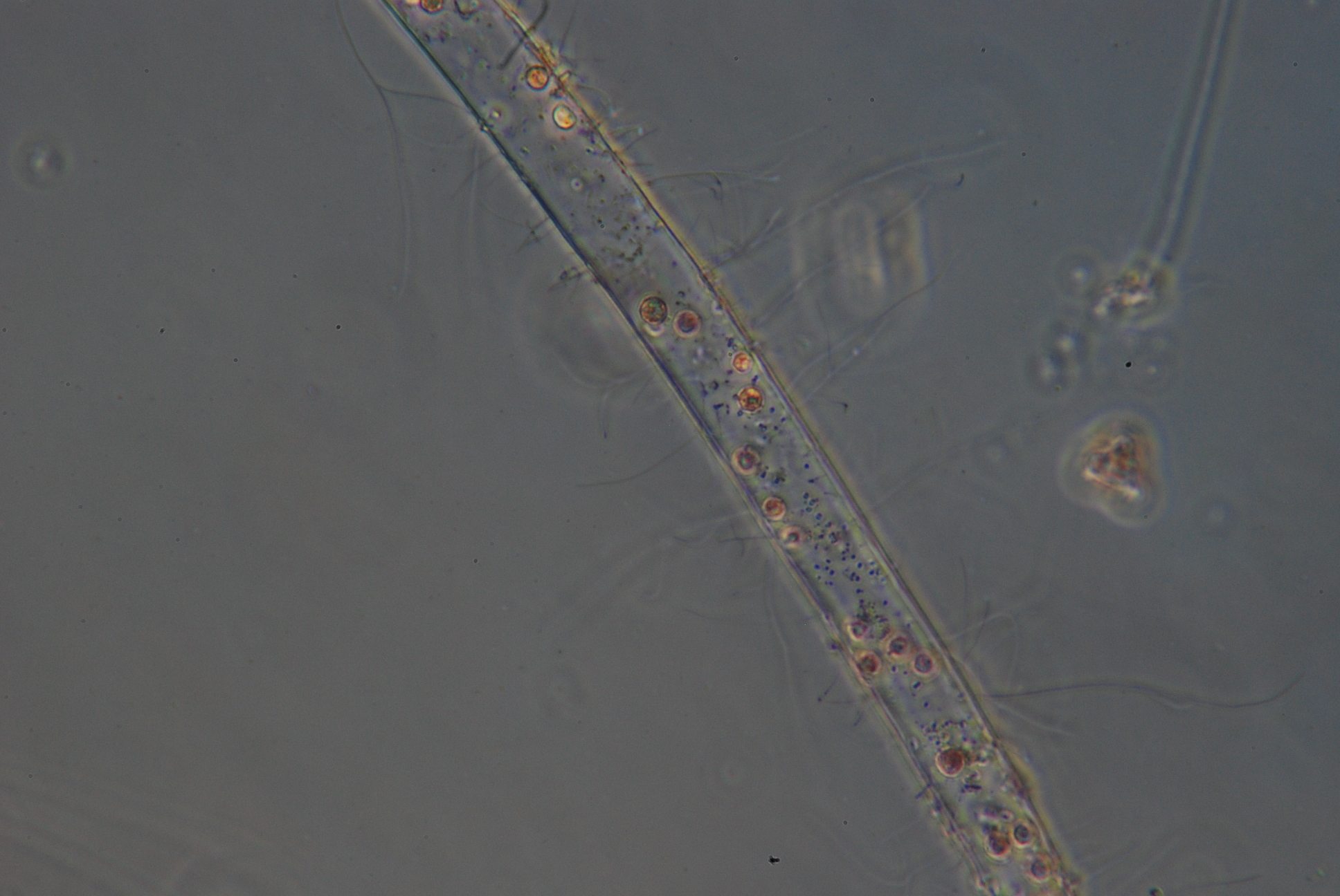 Beim Durchmustern fiel mir auf, dass eine der Wasserwurzeln bewohnt war! Anscheinend haben sich Geisseltierchen hier rein gemogelt. Da die Probe sehr dick war (Wurzeln!) sind Kontrast und Schärfe leider mangelhaft, aber man sieht sehr schön die Bewohner. Geschützt vor Feinden und in herrlich nährstoffreichem Saft! Die Geissel ist nicht sichtbar - nur bei direkter Beobachtung unter dem Mikroskop sieht man sie manchmal schlagen. Durch die Plasmabewegung reissen die Bewohner in einem Rundkurs durch die Wurzel. Manchmal benutzen sie die Geissel um woanders hinzureisen oder sich in einen anderen Plasmastrom einzuklinken.