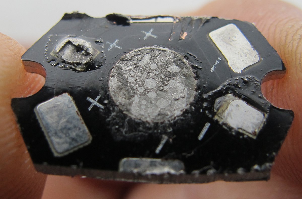 Und zu guter letzt hat sich die LED dabei dann auch noch ganz von der Alu-Platine gelöst. Weder der Wärmeleitkleber noch die Lötstellen der 2 Füßchen haben dabei überzeugt, denn an der LED ist eigentlich keine Kraft aufgetreten.