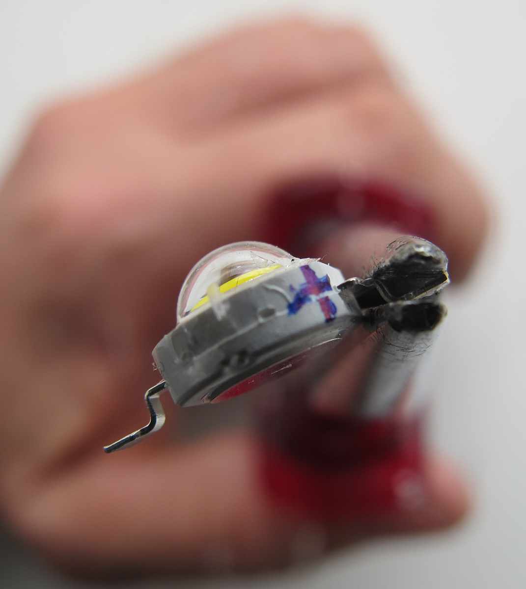 Der LED-Körper liegt also im Loch der PE-Isolier-Beilagscheibe mit der ganzen Fläche ungehindert auf der Alu-Schien auf. Die Kunststoffscheibe beginnt erst außerhalb des LED-Körpers, dort wo seine Beinchen keinen Kontakt mit der AluSchiene bekommen dürfen.