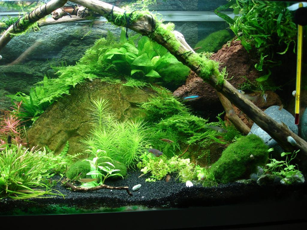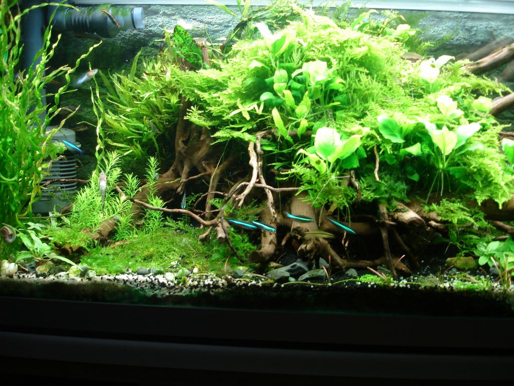 Keine Algen, Moose wuchern regelrecht. Das Pogestemon erectus wächst endlich, nachdem ich es aus dem 25 l Becken mit LED-Beleuchtung hier reingepflanzt hab.