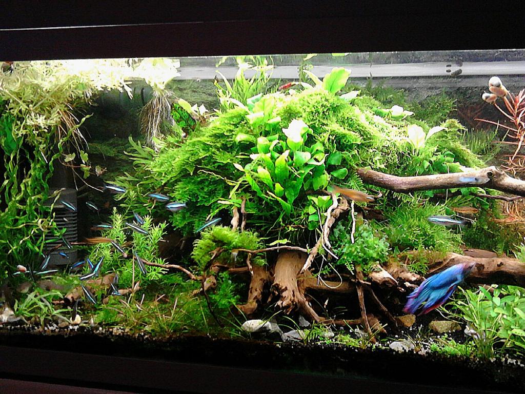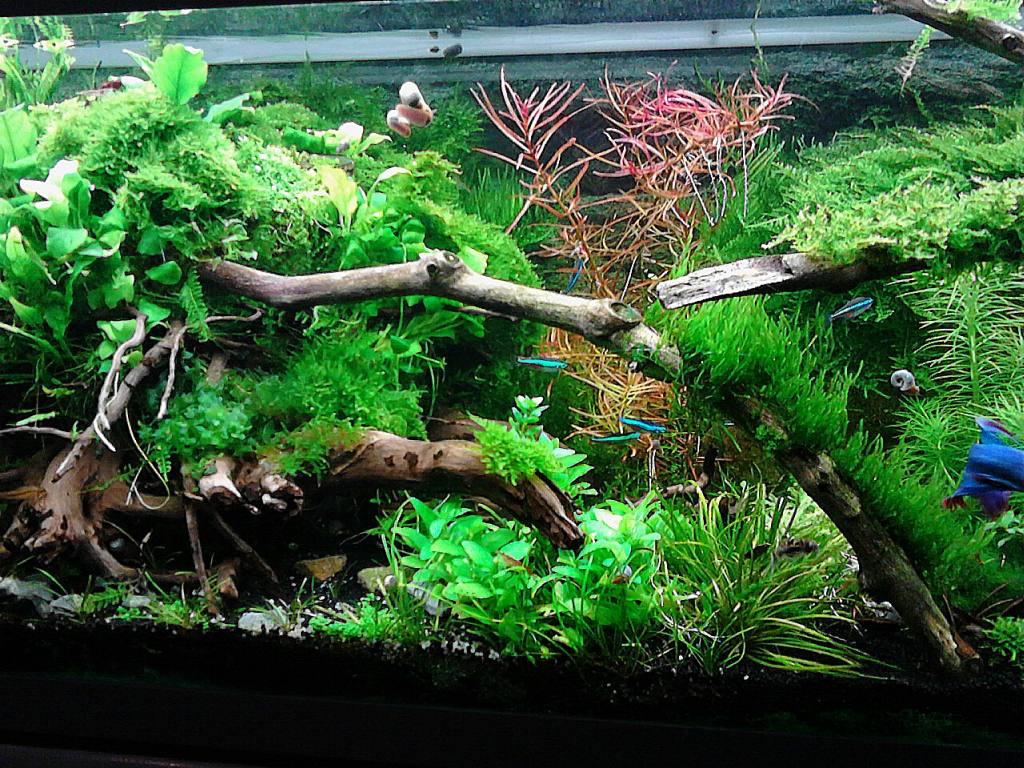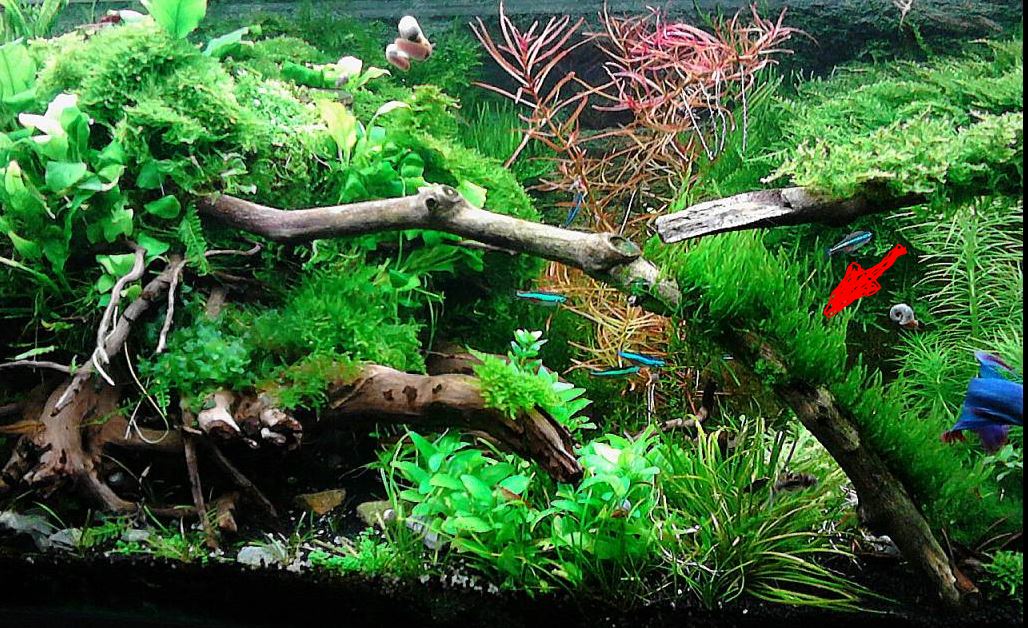 der Kafi fühlt sich sichtlich wohl... nur kleine Garnelchen seh ich keine mehr, sind aber sicher noch da im Moos. Erstaunlich ist, dass er die Guppyjungen nicht erwischt, sind wohl zu schnell.