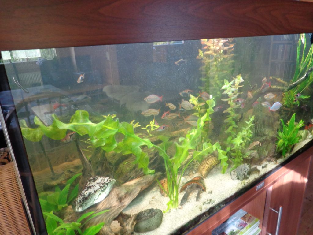Und jetzt sieht es so aus - hab geschwind noch ein paar dazu und das ist echt harmlos gegenüber voriger Woche und die Scheiben muss ich auch wieder reinigen, sehe ich gerade...aber Fische sind munter und gefräßig