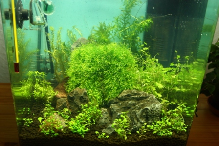 heute mal wieder ein update. Die Einlaufphase ist nun gut und vor allem ohne Algen überstanden. Endlich kann das Becken langsam sein endgültiges layout annehmen. Dazugekommen ist eine schöne große Matte "Teichlebermoos / Riccia fluitans" auf Drahtgestell. Die war in meinem "Pflanzenparkbecken" (altes 54l mit kleiner Plastikwanne mit den Pflanzen und Steinen drin und einer 18W T5) heute vor meinen "main stone" gesetzt worden. Das Moos gefällt mir schon recht gut aber so richtig sicher bin ich mir noch nicht. Würde es gern noch auf die kleineren Steine verteilen. Habe mit einer alten Drahtschere versucht das Stahlgitter kleinzukriegen. War aber nur zum Teil erfolgreich.... :grmpf: Habt ihr da Tipps?
