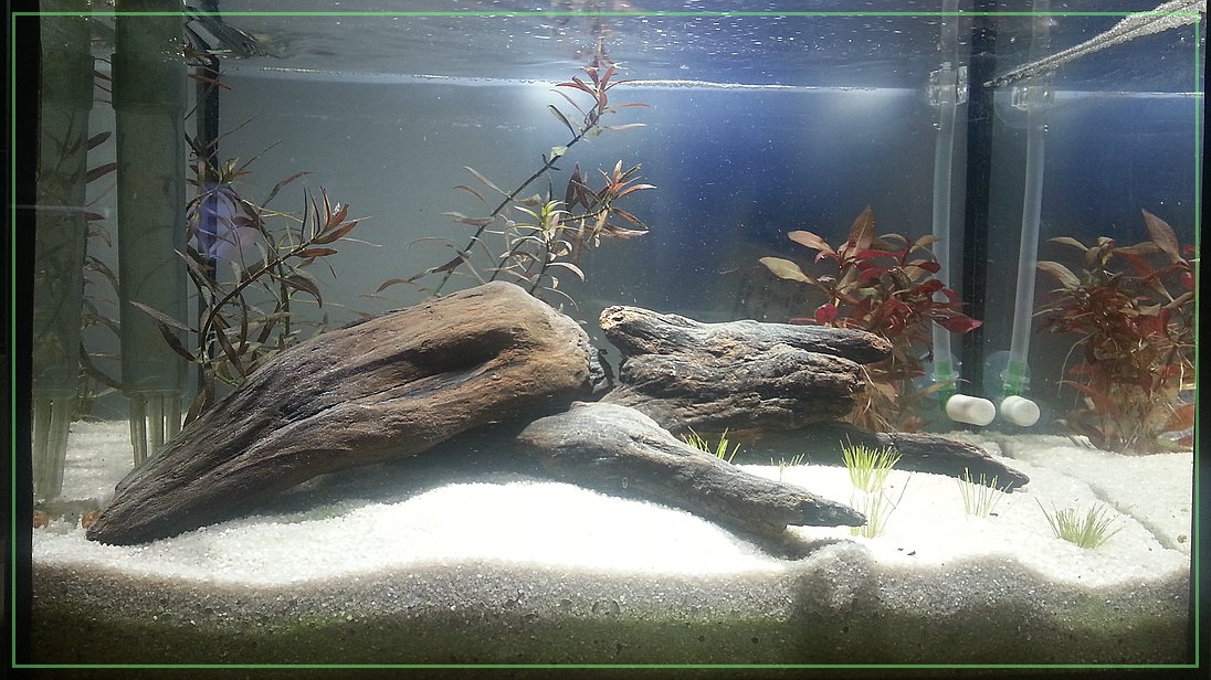 Der Hang-on Filter läuft nur mit einem kleinen mittelgroben Schwamm, also Geringfilterung, ich benutze außerdem eine von Vetzy hergestellte LED Leuchte. Angeimpft ist das Becken mit Microbe Lift Special Blend (das stinkt wie die Hölle :glotz: :wuerg: )
