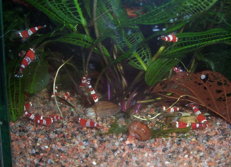 Ich habe unten mal Bilder von Anfang an eingestellt, hin und wieder hab ich es fotografiert. Die ältesten Bilder zuerst, der letzte Schnappschuß von heute. Mittlerweile sind die "Probegarnelen" wieder zu Gabi zurückgezogen und wurden durch eine Gruppe CRs mit schönem Weißanteil ersetzt. Die ersten Jungtiere schwimmen bereits.