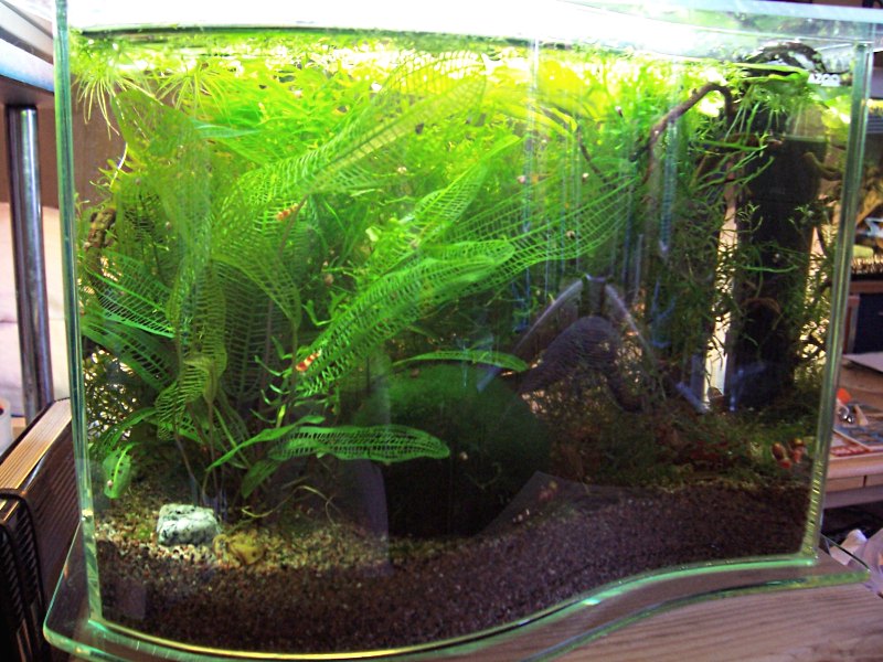 Seit ich im Januar einige Schnecken gesandt bekam und nicht wußte wohin damit, wurde das kleine Becken als "Notbehelf" eingerichtet, dazu haben wir Kies aus einem meiner laufenden becken geklaut, eine Handvoll Moos, einen Ast vom Haselstrauch, ein paar Muschelblumen und Ceratopteris-Minis hinengetan, den Filter angeimpft und dann die Schnecken eingesetzt. Diese haben wir 2 Wochen sparsam gefüttert, nach der Einlaufzeit kamen im Februar ein paar Probegarnelen hinzu und eine Gitterpflanze (Aponogeton madagascariens), die mittlerweile so gut wächst, daß wir überlegen sie umzusetzen in ein anderes Aquarium. Da diese sehr hinfällig sein soll, haben wir uns bisher nicht getraut.
