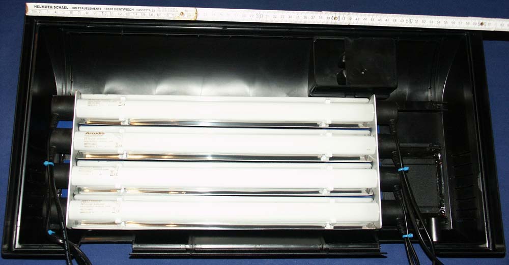Was aber, wenn anstatt des Außenfilters, ein Filter direkt in das Aquarium eingebaut wird und so 9 Liter Filtervolumen entstehen, sowie die gesamte Technik, sprich Heizstab und Förderpumpe darin verschwinden. Das macht die ganze Geschichte doch viel kompakter und zugleich sicherer. Abgesehen von den 10 Zentimetern, die wir für den Filtereinbau von der Gesamtlänge des Aquariums abgetrennt haben, die im nach hinein jedoch nur unwesentlich das Wasservolumen schmälern, haben wir trotzdem noch eine relativ große Grundfläche zum Bepflanzen. Schauen wir uns jetzt den Lichtkasten etwas genauer an, so stellen wir fest, dass es doch nicht so schlecht war, den Filter auf diese Weise einzubauen. Denn unsere Beleuchtung fängt erst weit von den Außenkanten des Lichtkastens an. Auf jeder Seite sind ca. 10 Zentimeter Platz, die nicht beleuchtet werden. Es entstehen so genannte Dunkelzonen. Leider sind die Leuchtbalken und Leuchtstoffröhren standardisiert, so dass jeder Lichtkasten nur die dafür vorgesehenen Lichtbalken aufnehmen könnte. Ich habe jetzt bewusst das Wort „könnte“ benutzt. Denn hier ist der Ansatz zum Tunen des Lichtkastens gegeben. Und damit auch die Lösung des nur zu bekannten Lichtproblems und das Ende vergammelter Pflanzen. Denn es gibt mittlerweile Pflanzen, die einen höheren Lichtanspruch haben. Da genügt es nicht, mal eben nur eine einflammige oder zweiflammige Abdeckung, mit drittklassigen Leuchtstoffröhren auf den Markt zu werfen. Hier hilft auch kein erstklassiges Foto auf dem Karton. Denn dies verspricht mehr als das Produkt halten kann. Nein, hier muss schon etwas mehr kommen. Noch dazu haben wir es in unserem Fall mit einem Waterhome Aquarium zu tun. Wir rüsten jetzt die Kiste auf 4 Leuchtstoffröhren auf. Na, die Rechnung gefällt dem Fachhandel schon eher. Oder etwa nicht? Jetzt ist richtig Geld verdient. Bausatz, Leuchtstoffröhren und Reflektoren. Da leuchten nicht nur die Röhren sondern die Augen aller Beteiligten.