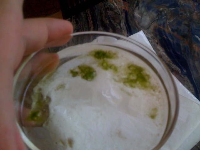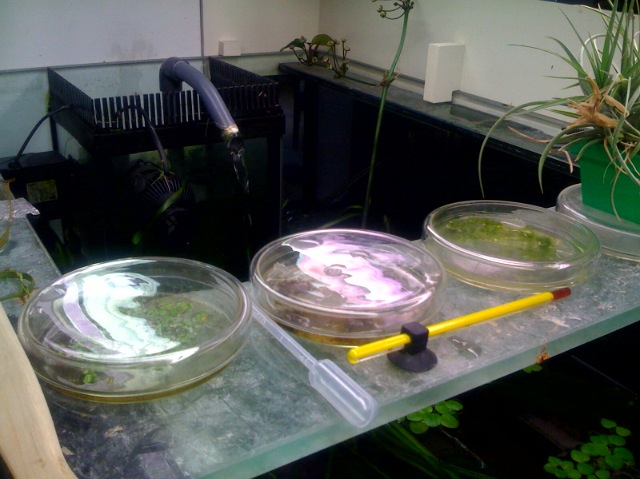 Proben werden in Petrischalen mit Nährlösung versehen und auf den Mittelsteg gelegt. Durch das Licht vermehren sich Algen gut. Im Hintergrund sieht man emerse Blätter einer Echinodorus.