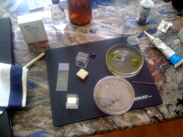 Mit der Tube Vaseline wird auf einem Objektträger ein Quadrat aus Vaseline aufgetragen. Mit einer Pipette wird ein Tröpfchen Wasser aus der Probe entnommen und in das Quadrat aus Vaseline gegeben. Dann kommt ein Deckglas drauf - etwas Luft sollte mit eingeschlossen werden. Dann drückt man leicht auf und fertig ist das "Mikroaquarium". Eine solches Mikroaquarium hält ein paar Tage und man kann die Entwicklung darin studieren.