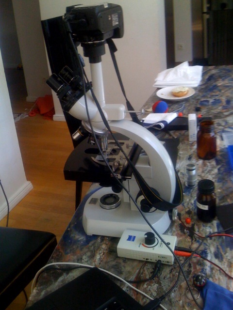 Dies ist mein Mikroskop mit angeschlossener Kamera und Computer. Das Bild wird von der Kamera sofort auf den Computer übertragen und steht zu Begutachtung bereit.