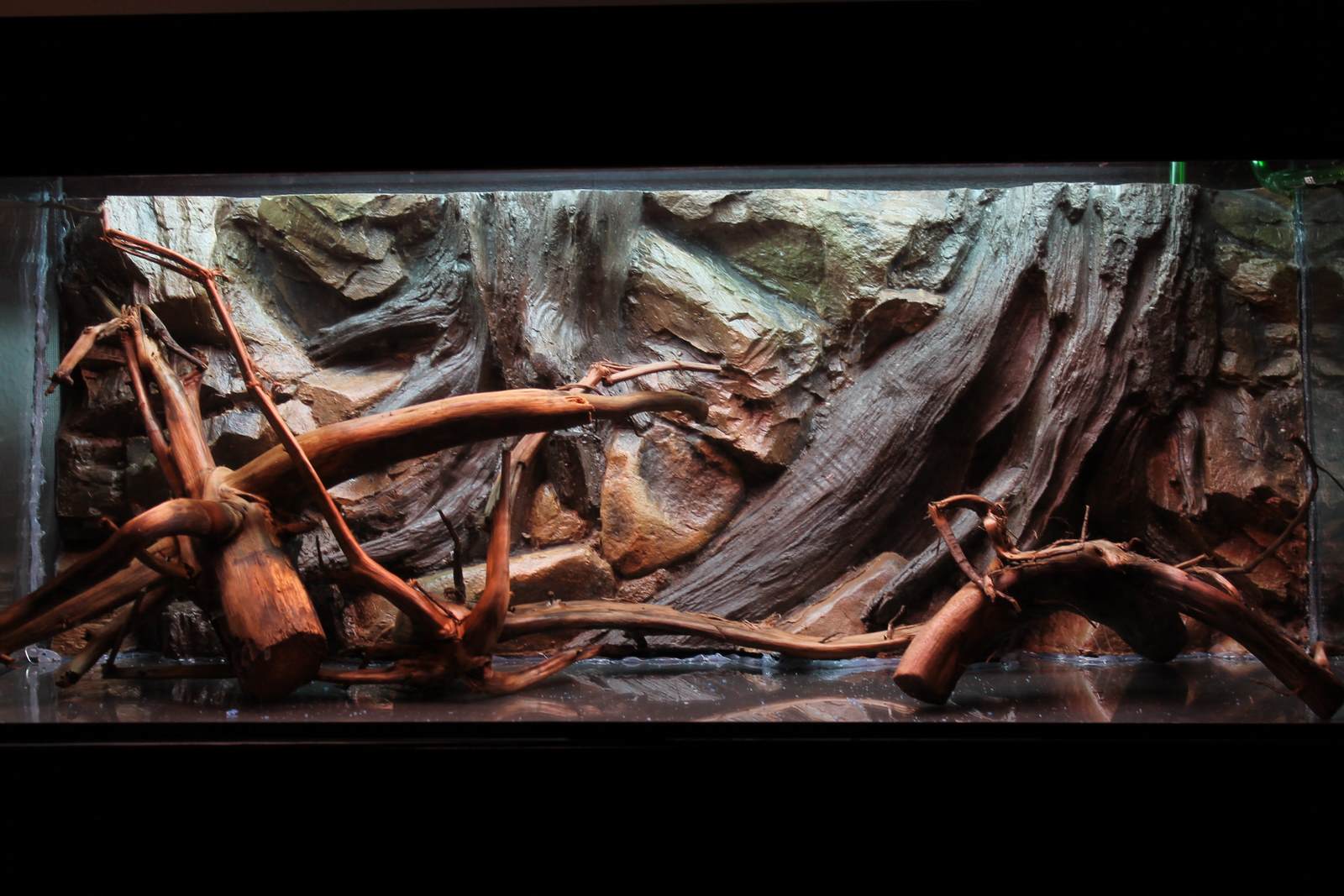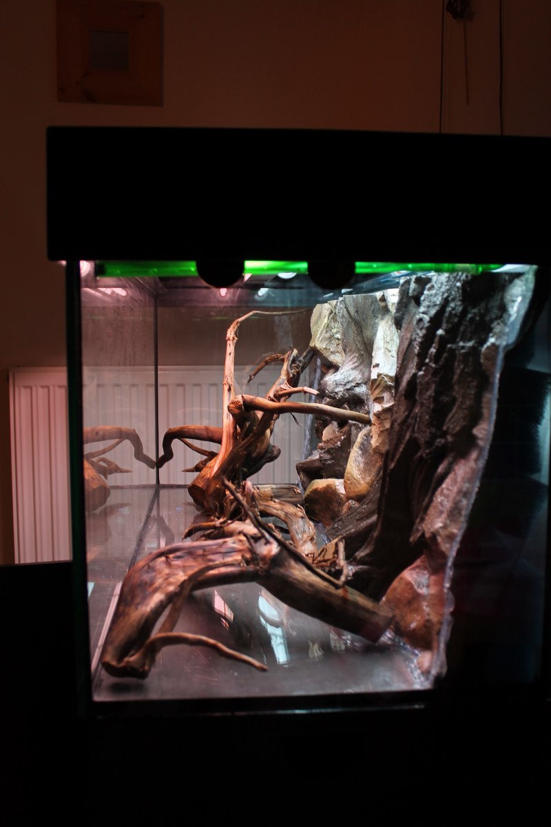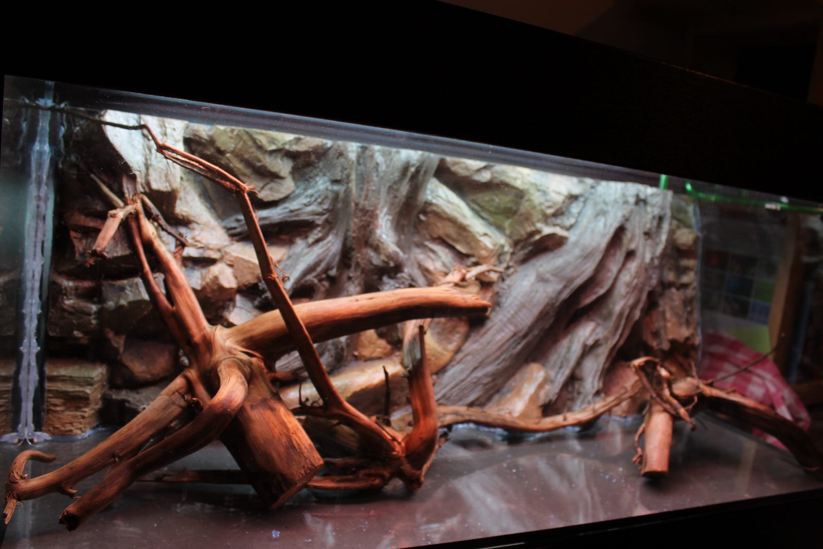 Deko: 4-5 Moorkien oder Mahagoniewurzeln, große runde, dunkelgraue Kieselsteine zwischen den Wurzeln, Laub