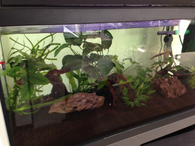 Fischbesatz: sehr gering, 2 Normans Leuchtaugen (den Rest hatte der Engelswels verdrückt, der wiederum endlich ein neues Zuhause, mit viel Schwimmfläche und 3 weiteren Kumpels gefunden hat), 5 Sternflecksalmler, 2 Keilfleckbärblinge, 1 Dornauge und ich schätze noch 3-5 kleine Rückenstrichgarnelen.