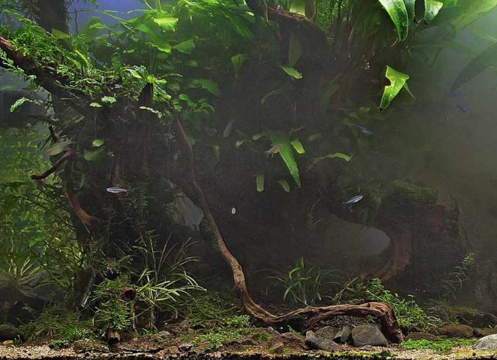 Ich will zwei Themen verbinden, die man wie so ein Wechselbild entweder so oder anders betrachten kann: einmal die Vorstellung, dass es sich um eine eins-zu-eins Unterwasserszene mit Driftwood und entsprechend großen Pflanzen handeln könnte und zum anderen soll man ein Landschaftslayout entdecken können, eine Djungelszene mit "hidden valleys". Aber ich muss ich das wohl noch irgendwie deutlicher machen.