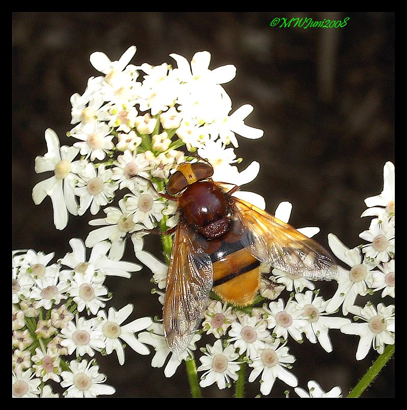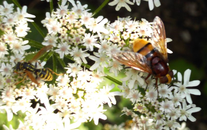 Die Schwebfliegen sind die Schafe im Wolfspelz...sie tarnen sich als stechende Insekten... zb. Wespen, Bienen und sogar Hornissen..die hier war fast 3cm groß :happy: Die Fliegenaugen und der Schwebende Flug zeigen an das es eine Fliege ist...zum Vergleich die Augen der Wespen, die nicht in der Luft stehen können...