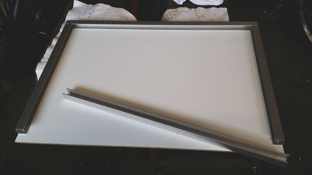 Die erste Rückwand habe ich mit einer Holzleise 20x20mm rundum eingesäumt und darauf ein 2m langes selbstklebendes LED-Band montiert.