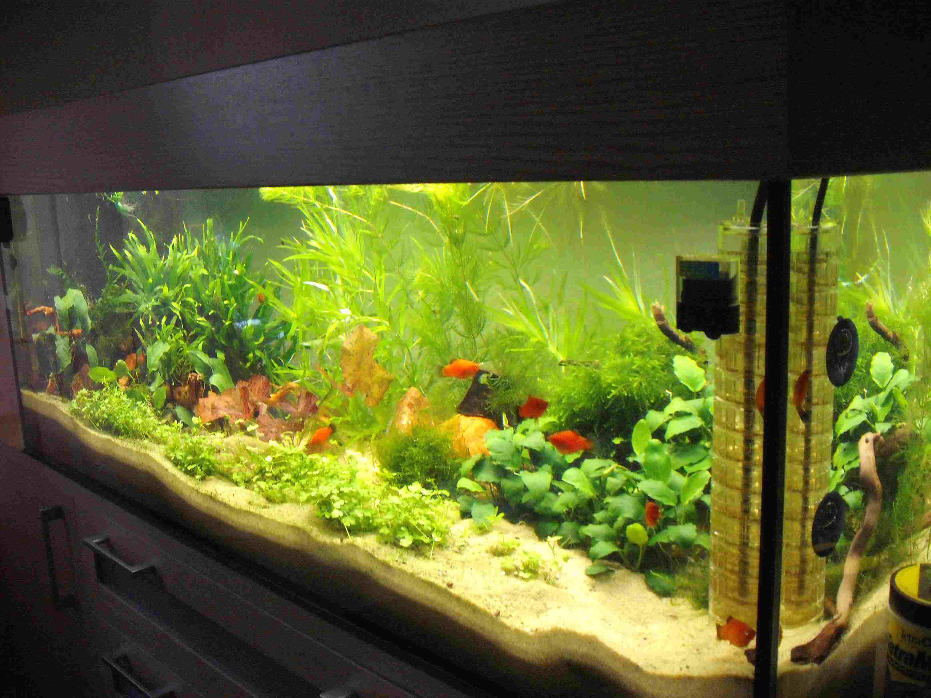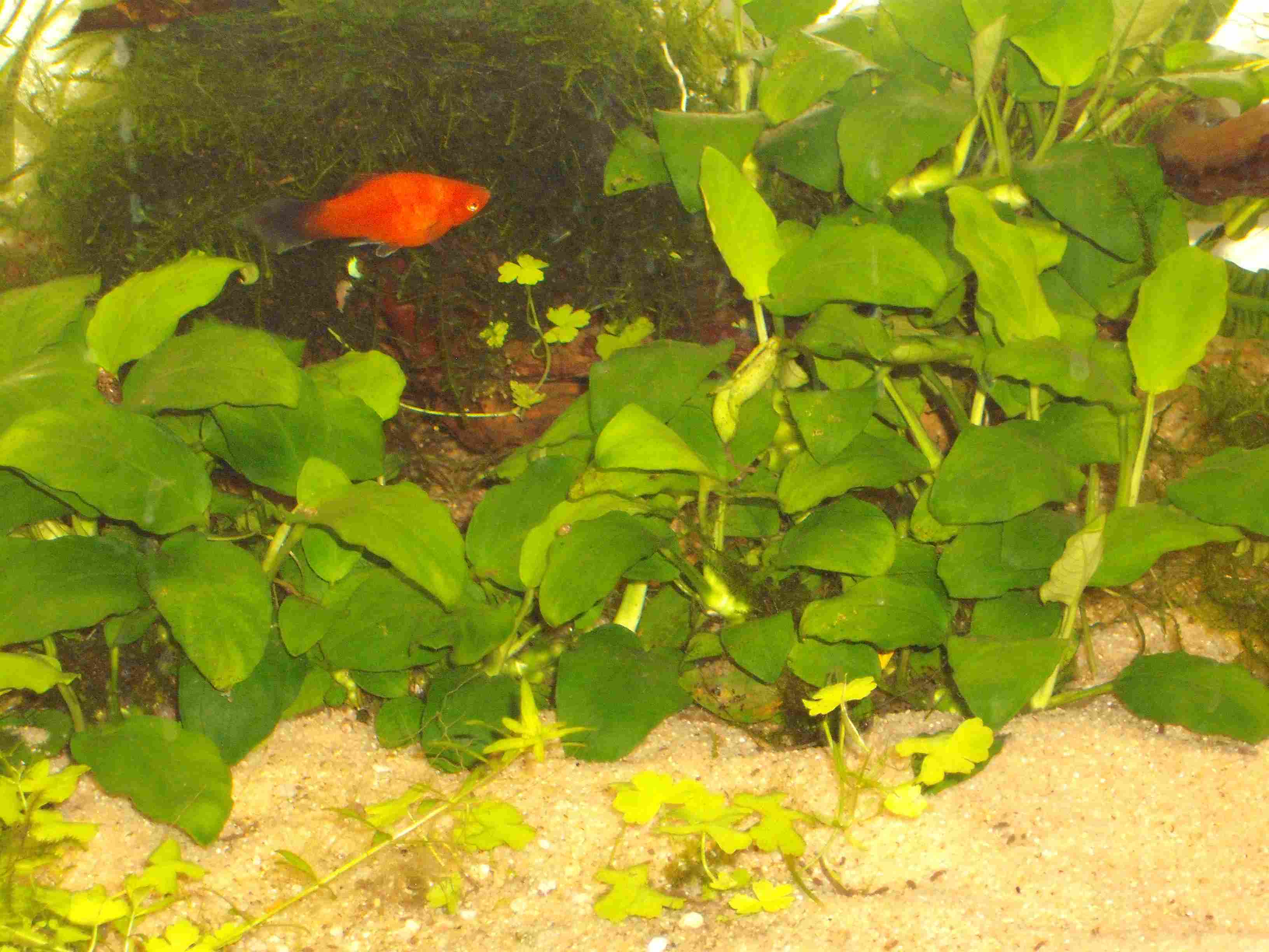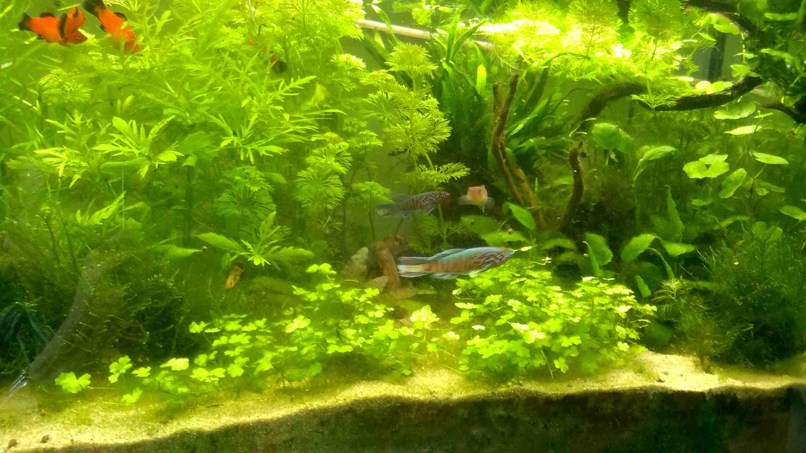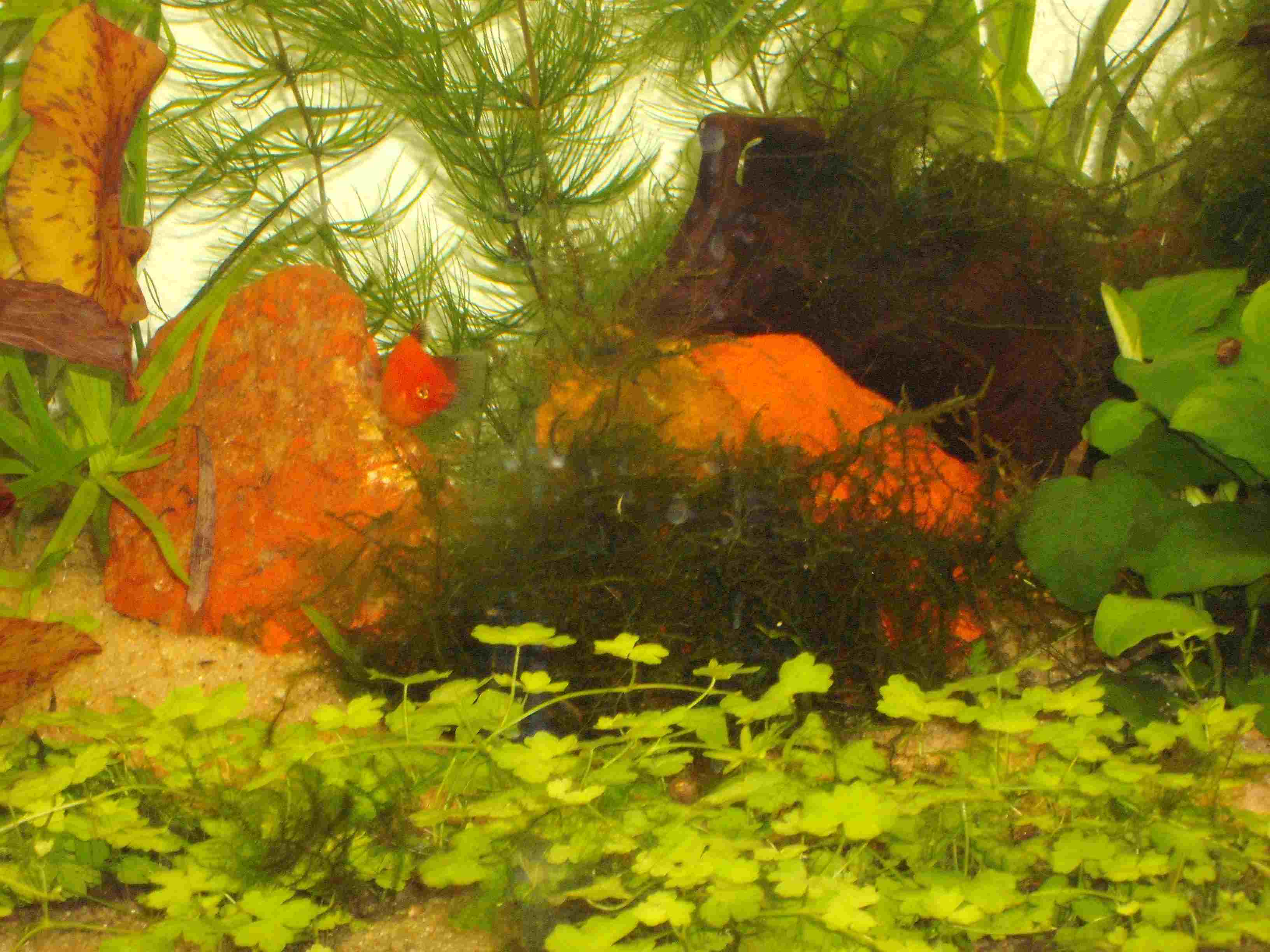 8 Wagtail-Platys, selbst nachgezogen - auch als Einfahrbesatz. Die sind super Algenvertilger. Wer sie möchte, kann sie bei mir abholen. Dazu kommen natürlich Blasenschnecken und Rennschnecken.