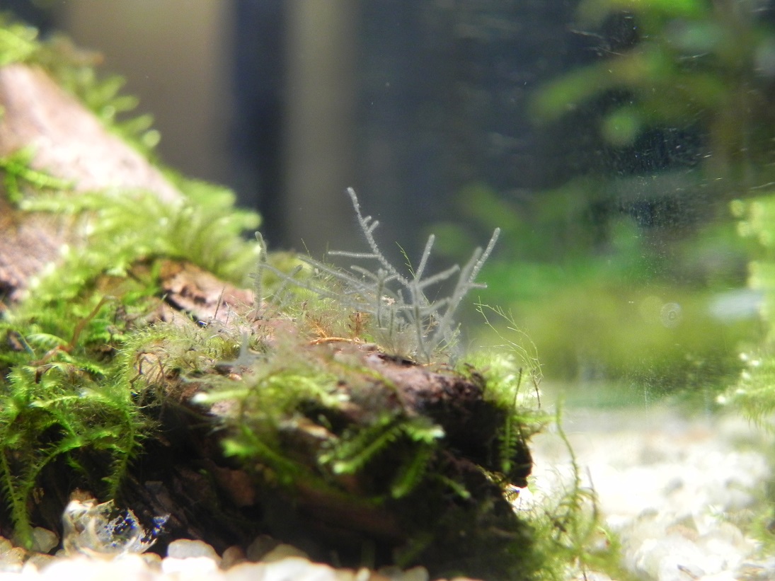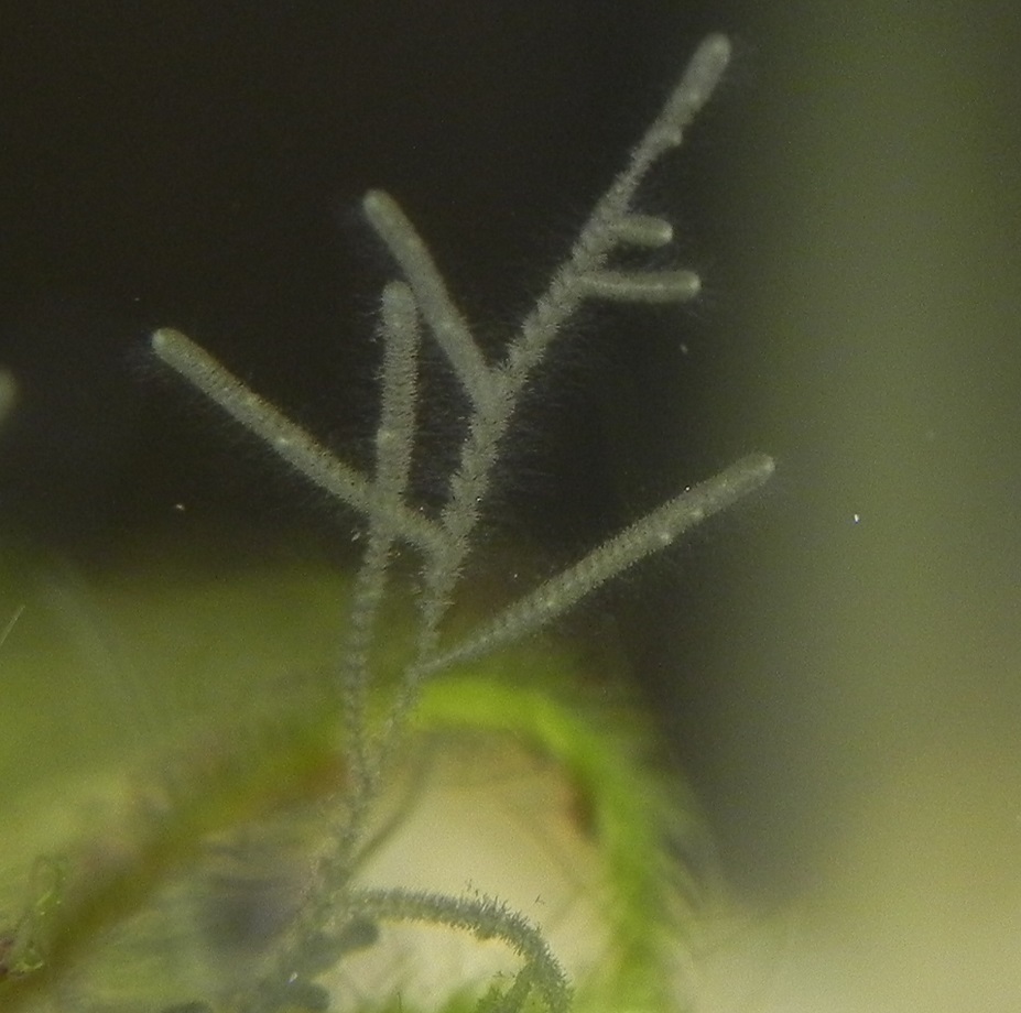 Batrachospermum gelatinosum (derzeit ca. 1cm) erschien erst vor kurzem bei Karbonathärte 6 nachdem mir das CO2 ausging und dadurch der PH-Wert in den alkalischen Bereich wanderte und hält sich seitdem auch im sauren Milieu.